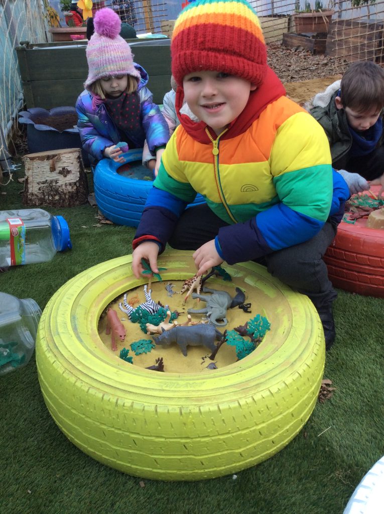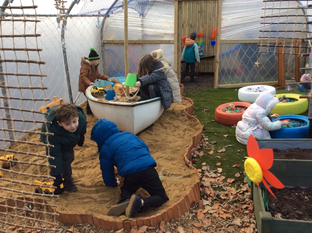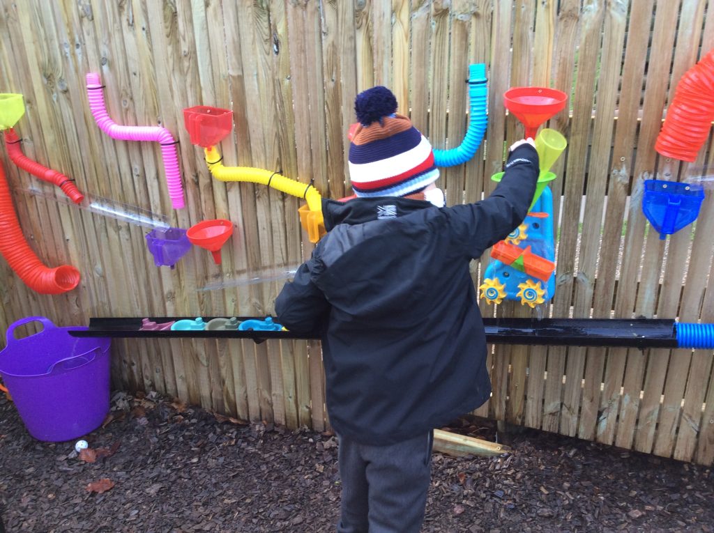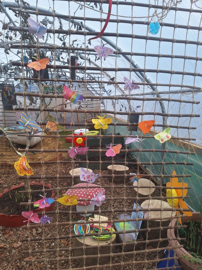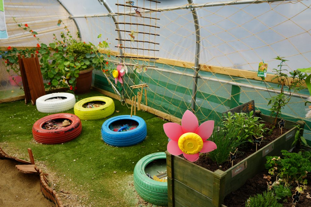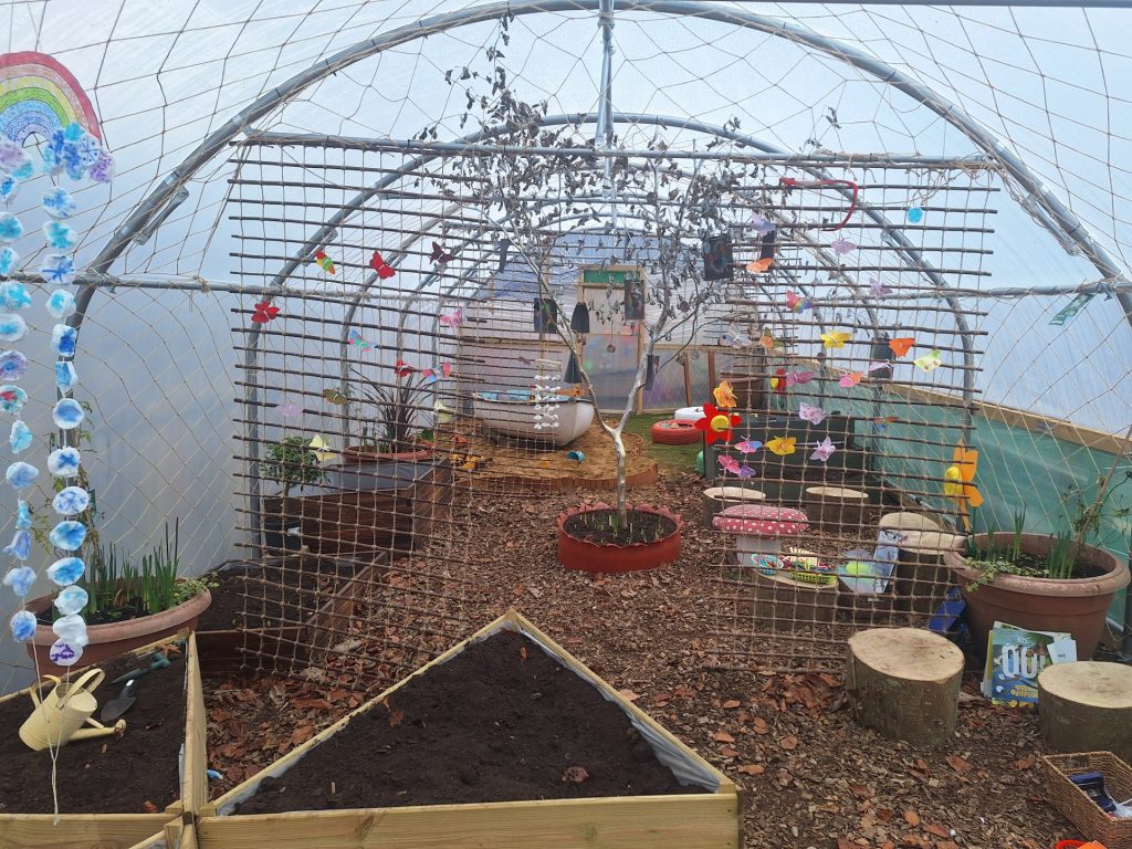 On the bottom playground we have a ‘Sensory Polytunnel’ the children use this area at playtimes in small groups, for calm activities to encourage them to problem solve, create and have time to talk. We also use this space for small group work to support communication development. It is rotated around all classes to ensure every child has an opportunity to regularly use the polytunnel.
