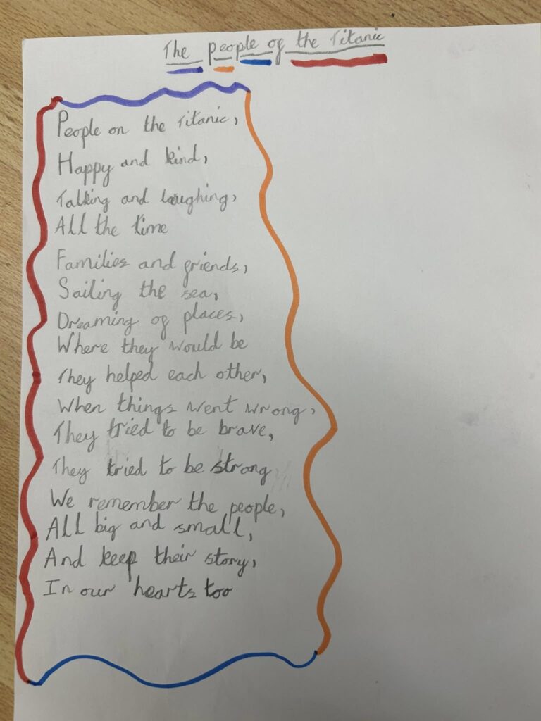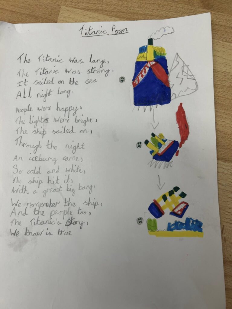 Titanic poem February 9, 2026 - 12:02 pm Benjamin from Woodpeckers created these beautiful Titanic poems at home over the weekend! Seeing them first thing totally made Mrs Lewis’s day We are so proud of you, Benjamin!